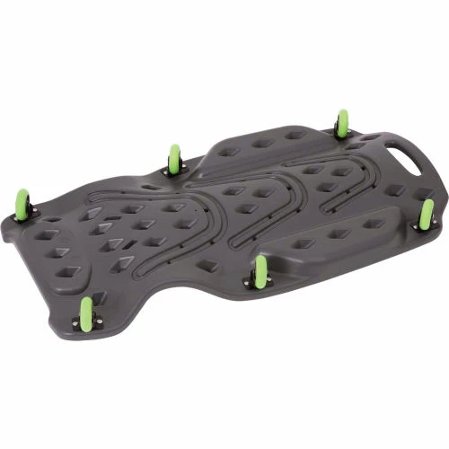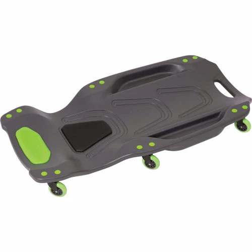 Made with 100% High Density Polyurethane for unparalleled strength and long life. 440lb capacity and 42″ length fits most users comfortably. 6 large, double post 10 spoke inline swivel casters, provide a smooth ride and are oil and grease resistant. Ergonomically designed head and neck pads provide extra comfort for the user. Dual molded-in tool trays offer the user a convenient place to store tools and parts while laying down. Specially molded u-channels provide increased air flow and breathability while working in warmer environments. Light weight design, weighing only 12lbs, allows easy storage; can be hung out of the way using the convenient carry handle. 1 Year Limited Warranty.