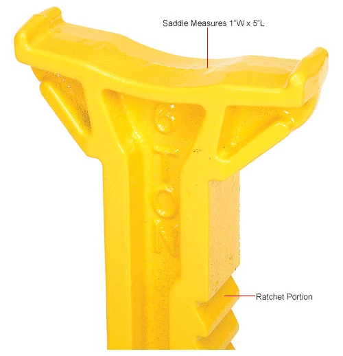 Saddle column provides ratchet action height adjustment. Dual purpose handle serves as carry handle and saddle column release. Formed steel frame means tough rugged construction. Multi-position ratchet bar provides strength and durability. Legs have folded metal footing to spread weight more evenly, protecting road and parking lot surfaces and significantly reduces setting while working under the vehicle. Formed base adds stability and helps reduce sinkage into pavement. 10-1/2″ x 13″ Base; 1″ x 5″ Saddle. Ratchet action assures no accidental of load. Easy to use builds over user confidence and lends to more frequent usage. Two year limited manufacturers warranty.