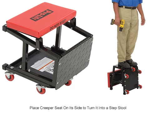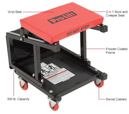 Pro-Lift 300 lb. Cap. Creeper Seat/Stool Combo – C-2800 provides a unique combination of a creeper seat and a step stool making it a great addition to any garage. The versatility of this creeper creates a range of access from low on the creeper seat to above/ standing on the step stool. This seat/stool will also help to consolidate your work area by keeping your tools on you with the added tool tray.
