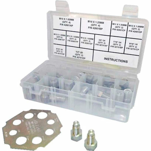 Enables the technician to isolate the Master Cylinder from other brake components It tests whether the internal seals are leaking or in good condition. Kit has 26 machined aluminum plugs to fit most domestic and import vehicles and includes enough plugs to meet latest master cylinder designs. SAE sizes include: (2) 3/8-24, (2) 7/16-24, (2) 9/16-18, (2) 9/16-20 and (2) 1/2-20 Metric sizes: (4) M10x1.0, (4) M10x1.25, (2) M11x1.5, (2) M12x1.0, (2) M12x1.5 and (2) M13x1.5.