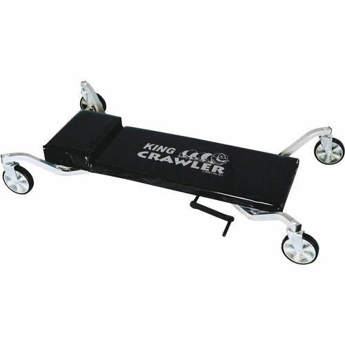 Lever activated brake raises casters from surface Large 13 in. x 38 in. padded deck with integrated headrest Constructed of a 1 inch square powder coated steel frame Easy rolling 5 in. PVC casters Graphics reverse printed, won’t fade or flake The 400–lb. capacity King Crawler creeper is a unique ‘All–Terrain’ creeper that goes where other creepers can’t. 1 in. ground clearance and low center of gravity on (4) 5 in. PVC swivel casters with axle bearings allow for easily rolling over almost any outdoor, garage or shop surface. Unique brake lock system incorporates a one–handed easy–pull lever operation that restricts the 4 wheels from moving while you’re working on your vehicle. This is an excellent feature when applying pressure to frozen fasteners or working on tight bolts, nuts, oil filters, etc.